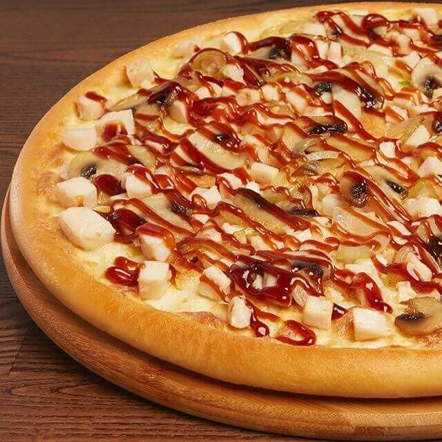 Состав: пицца соус, соус барбекю, моцарелла, пармезан, курица, грибы, красный лук
