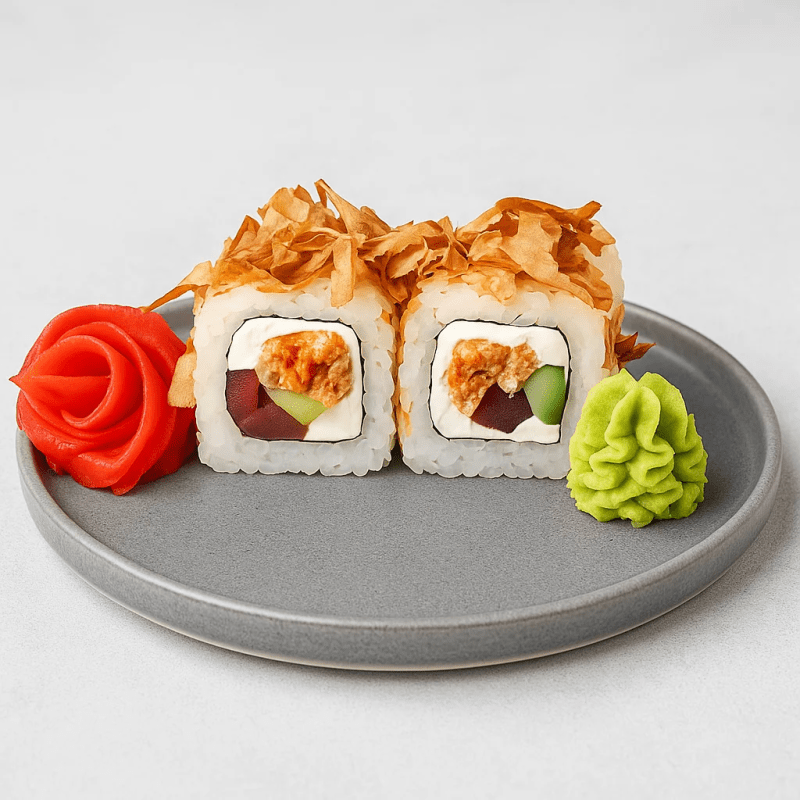 Состав: Рис, жареный лосось, авокадо, помидор, майонез, тобико, стружка тунца