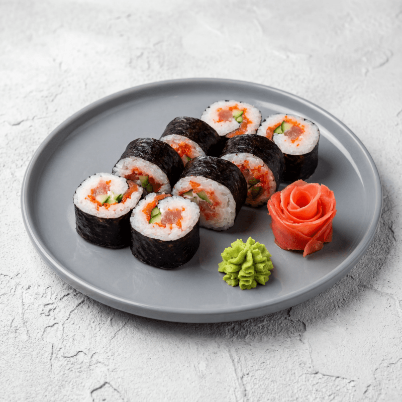 Состав: Рис, лосось, тунец, тобико, огурец, соус спайси