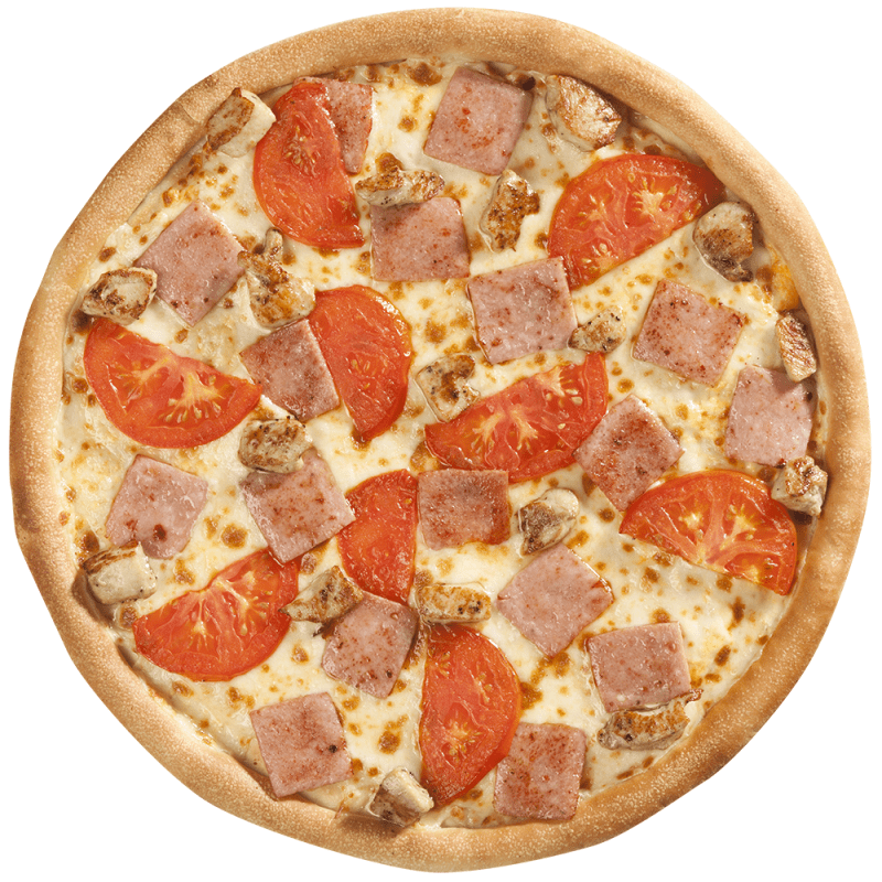 Состав: соус сырный, моцарелла, ветчина, помидор, курочка