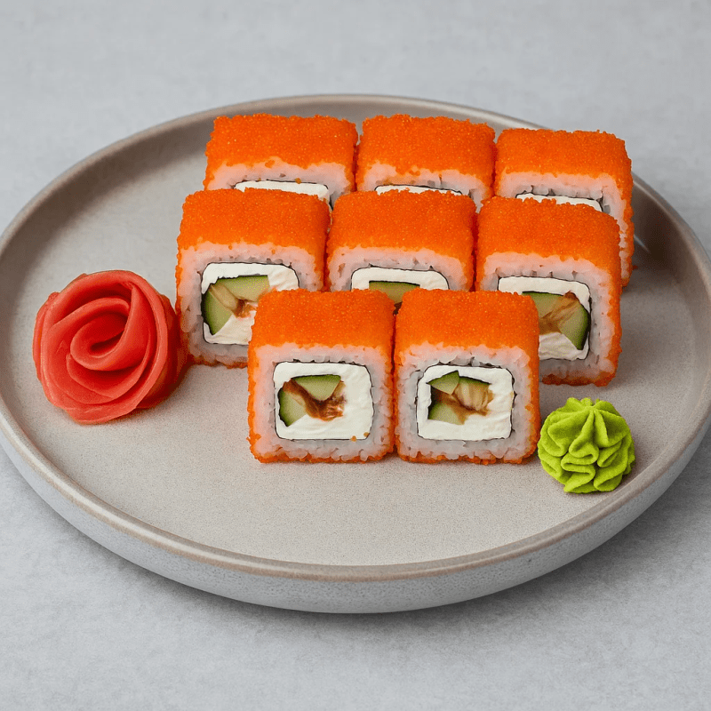 Состав: Копченый угорь, тобико, сыр, помидор, соус унаги