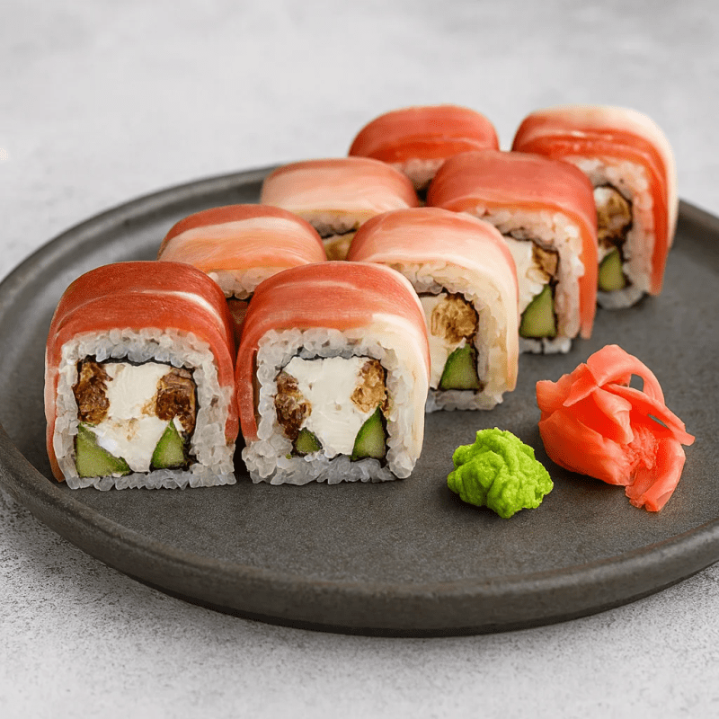 СОстав:Рис,копченый угорь, сыр, огурец, соус унаги, бекон