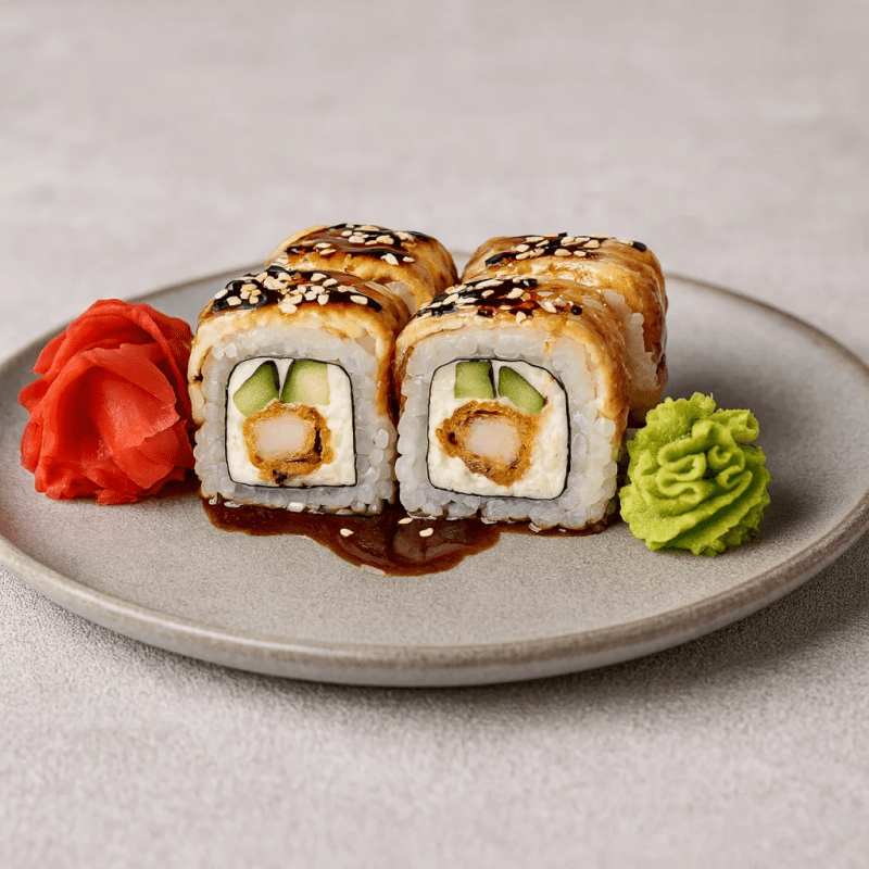 Состав: Рис, копченый угорь, креветки, авокадо, майонез
